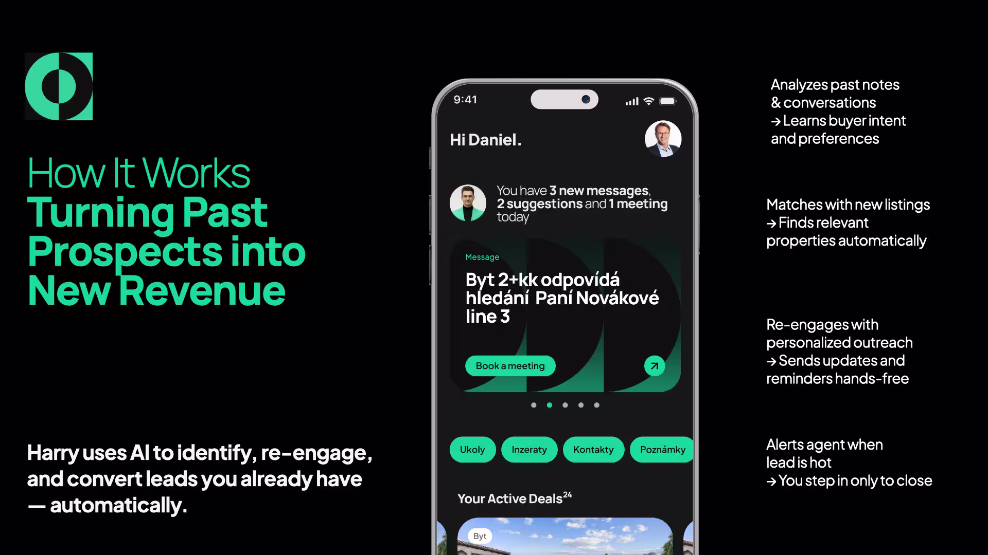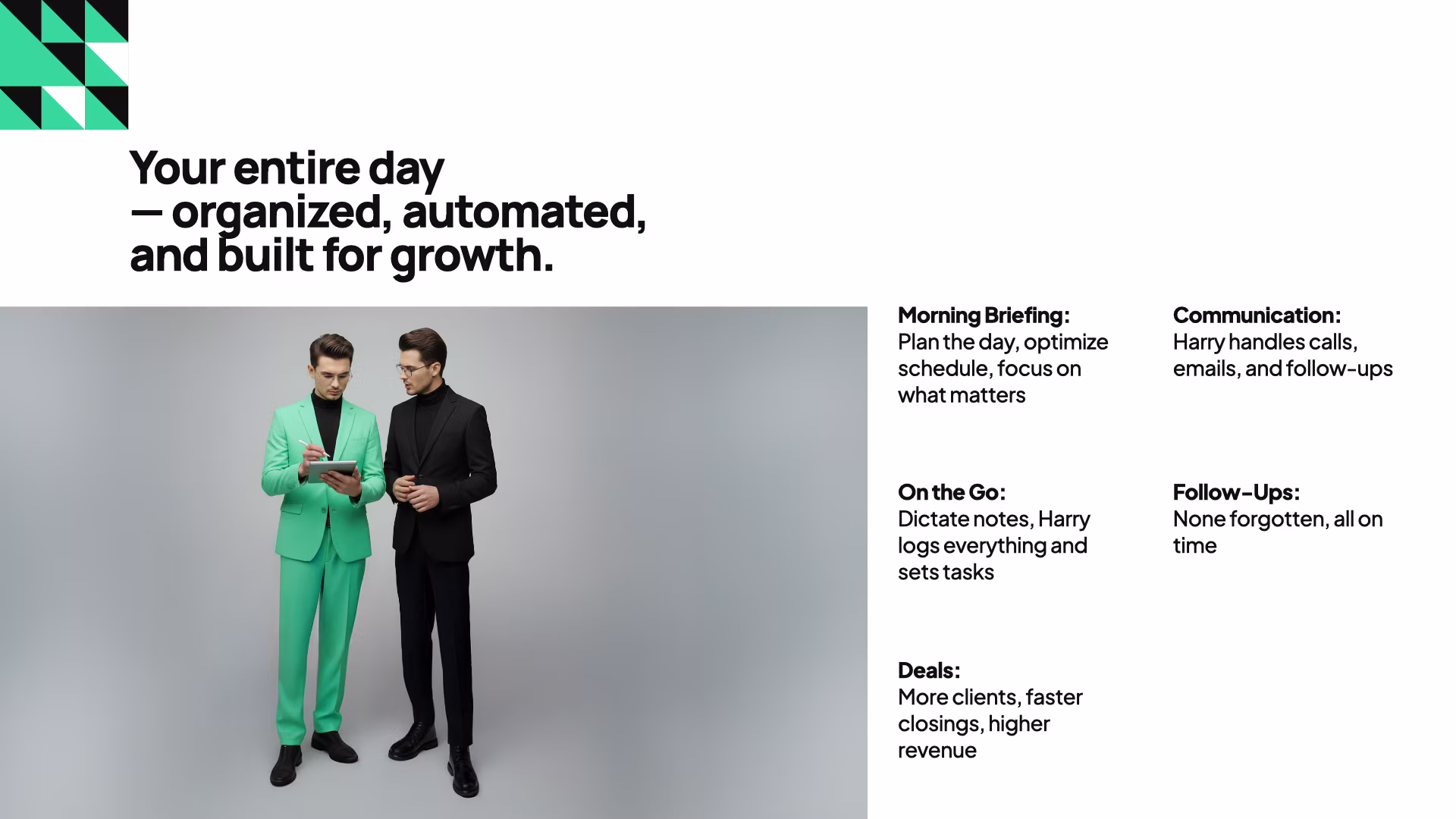 We focused on shaping Harry’s personality before anything else. His name, tone of voice, and visual language were designed to feel calm, confident, and natural - never futuristic for the sake of it, never cold or over-engineered. The identity balances professionalism with warmth, allowing Harry to exist as a “twin” rather than a tool: present in the background, supportive when needed, and always respectful of the human in control. Every brand decision reinforced this relationship, ensuring that the AI feels like an extension of the agent, not a replacement.