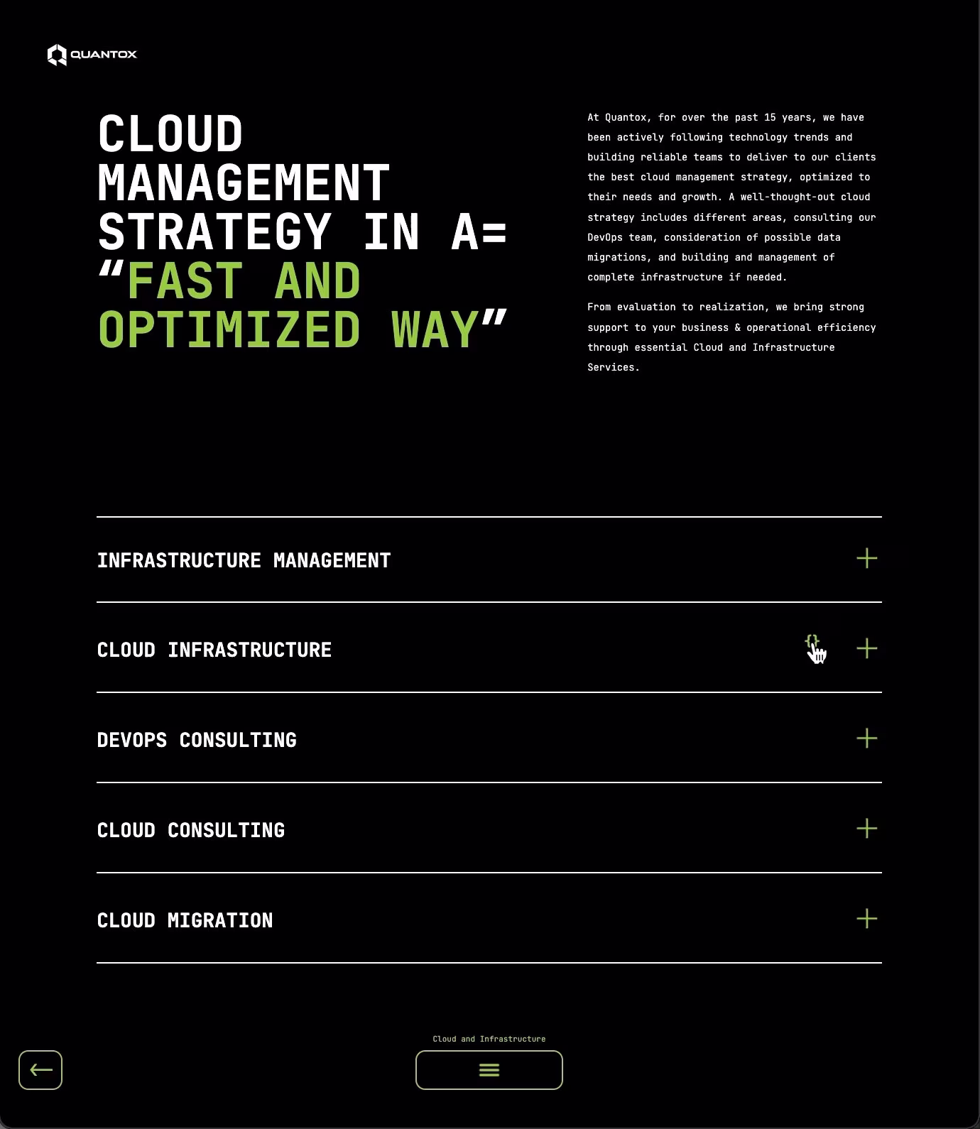 Quantox is a leading edge developer for applications on any device, which we decided to incorporate visually with illustrations of devices. Furthermore, to take some load off the user we compressed the content while retaining all of it through accordion and tab menus in key places, as well as animating listings to make them more engaging.
